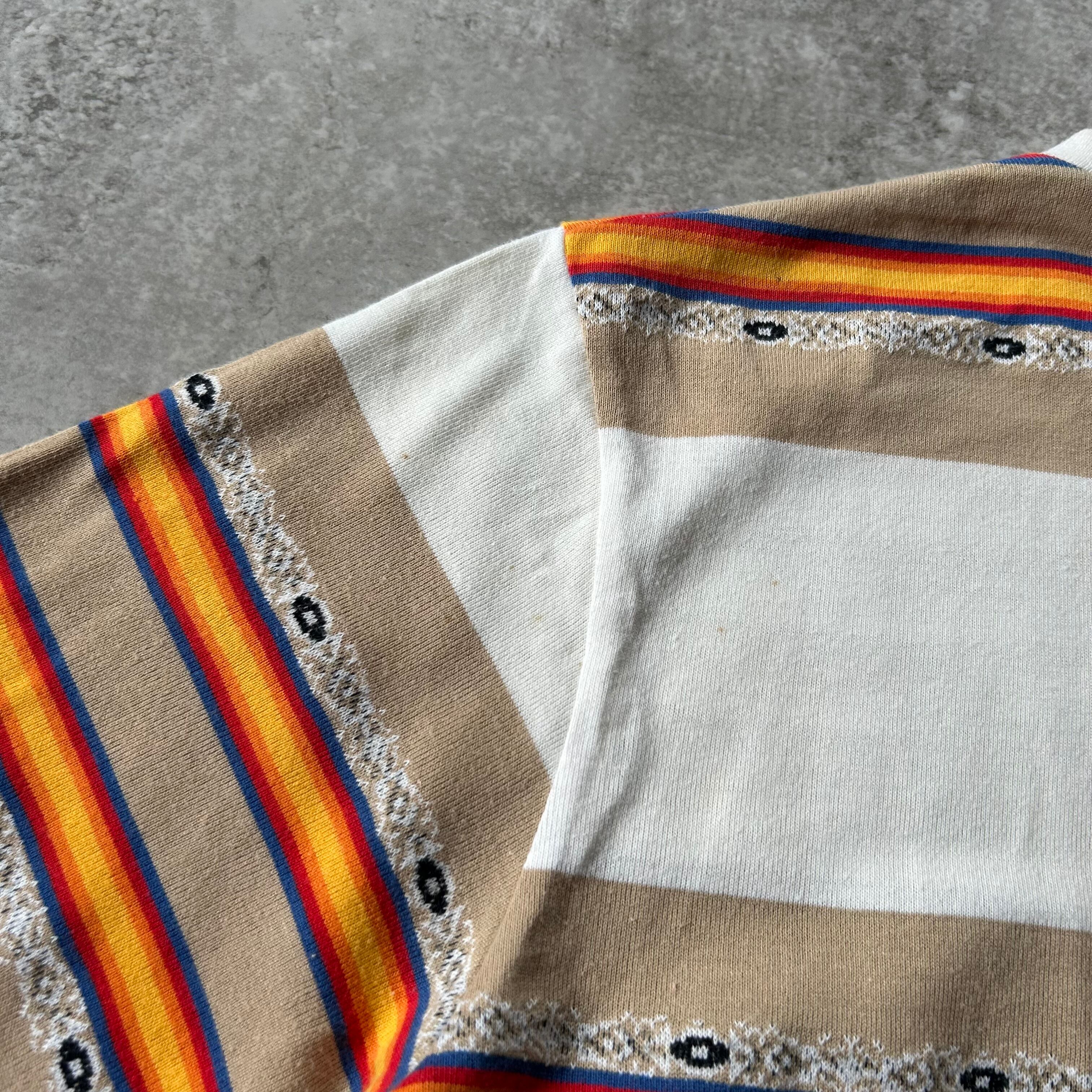合わせやすいホワイトボディに珍しいネイティブ/チマヨ調のボーダー柄。ジャストめに着られるサイズ感も今っぽくて◎