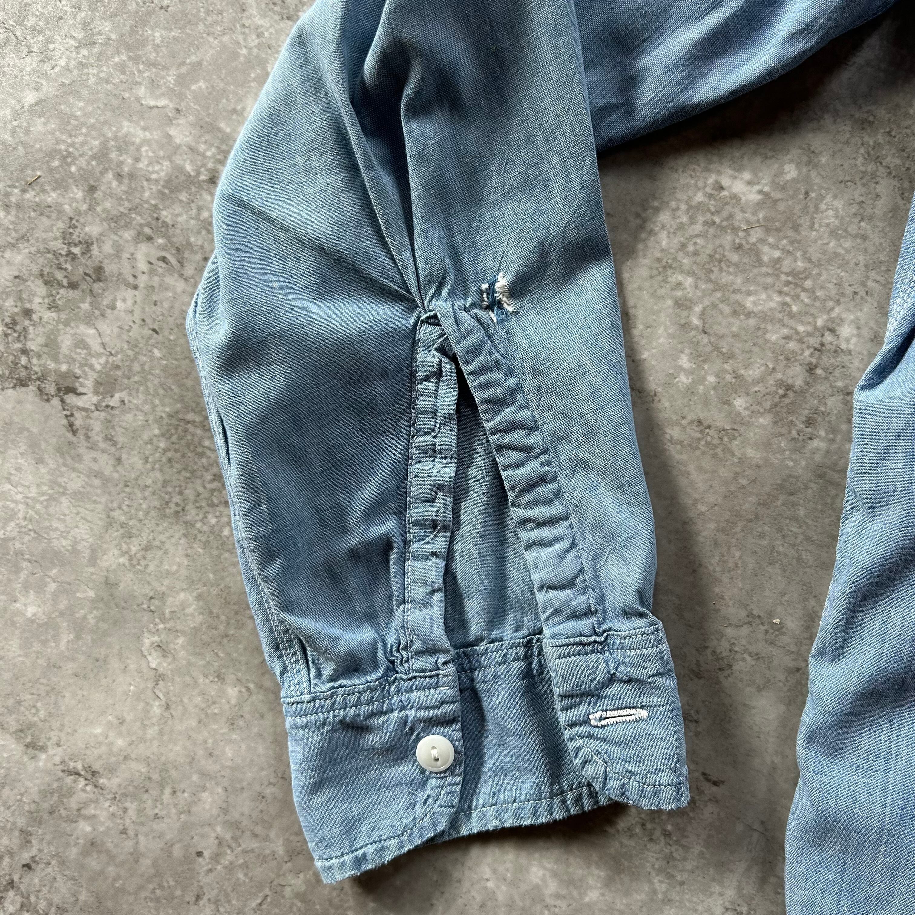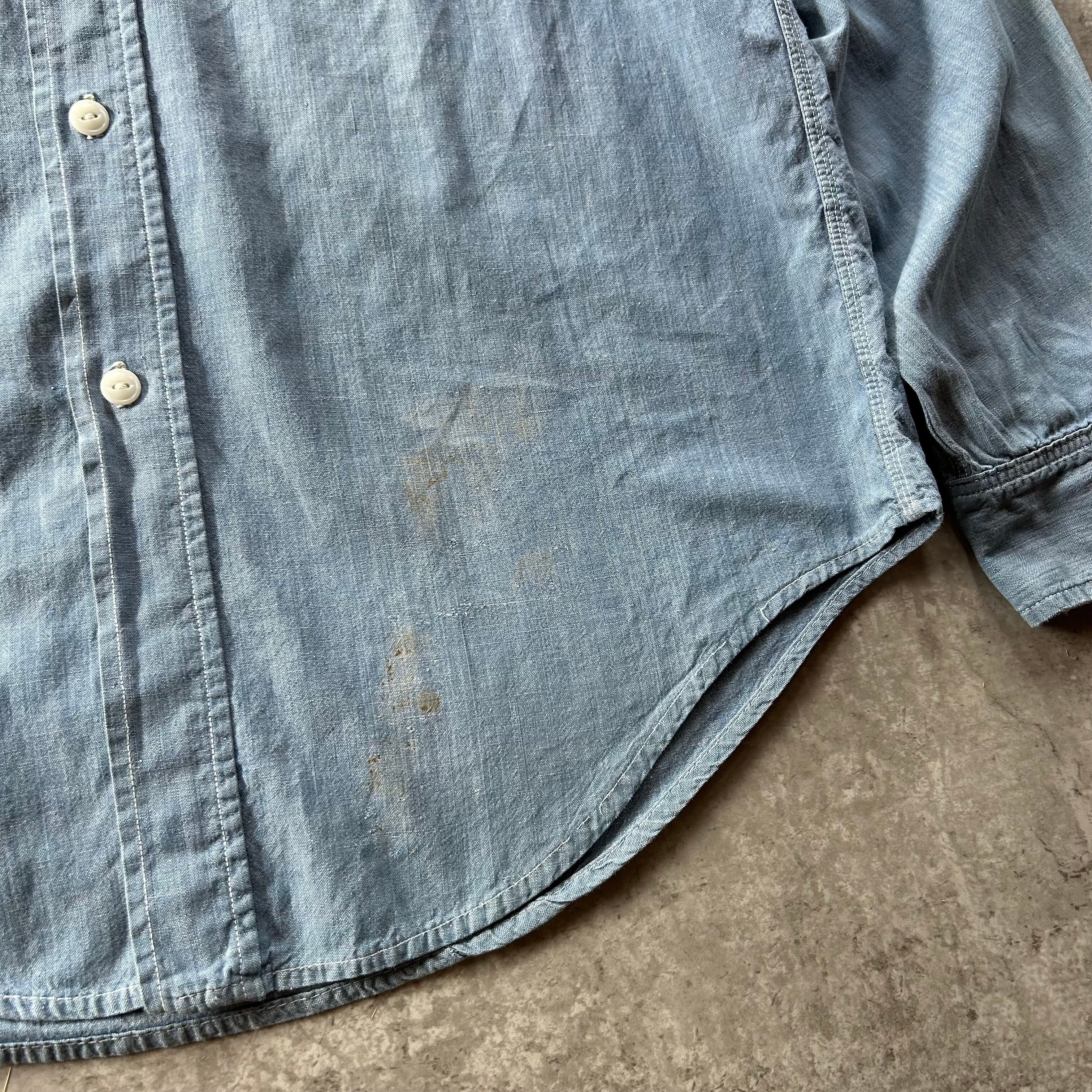アメリカ古着・古着好きとしては定番アイテムのシャンブレーシャツ、やや汚れ等はあるもののボディの状態は良好。