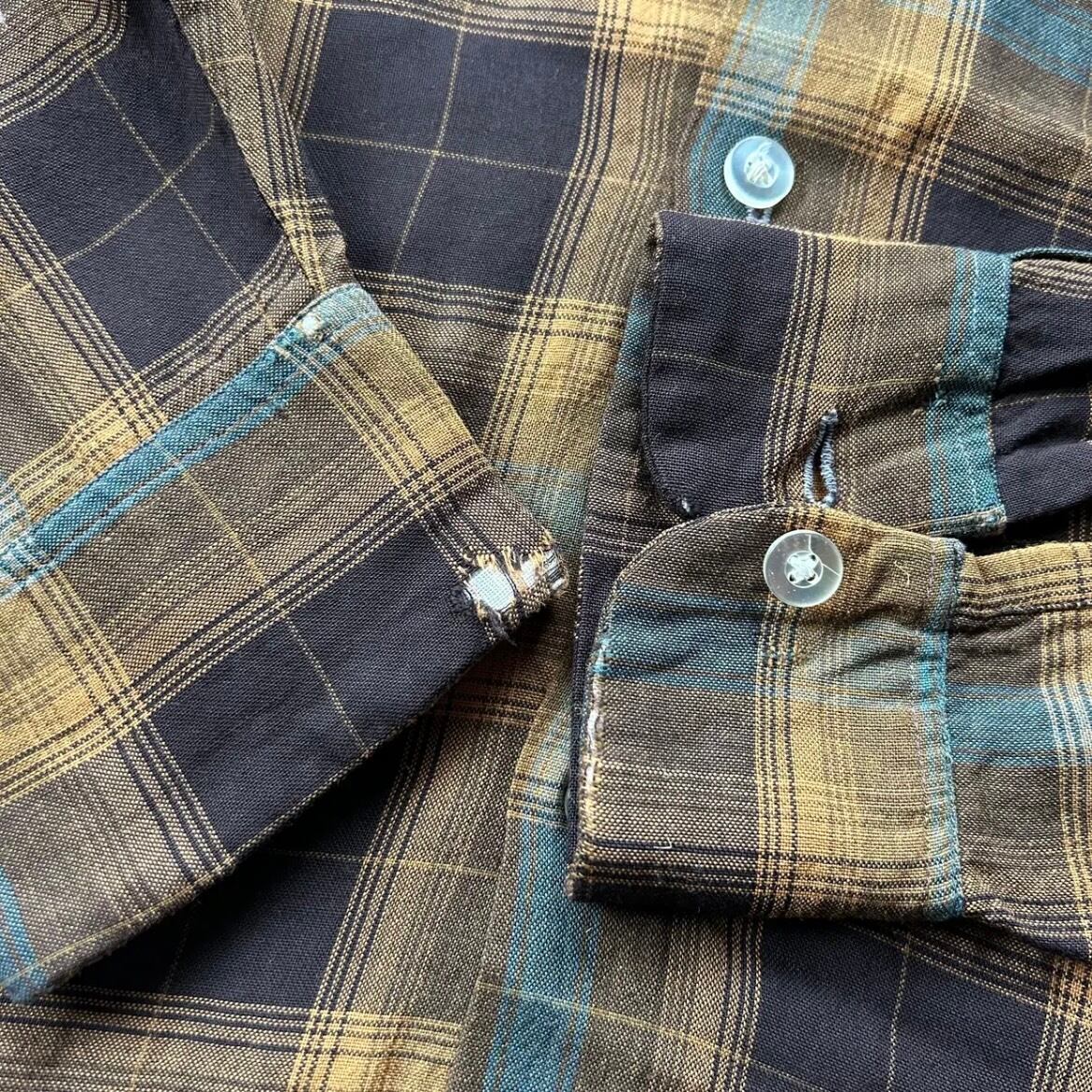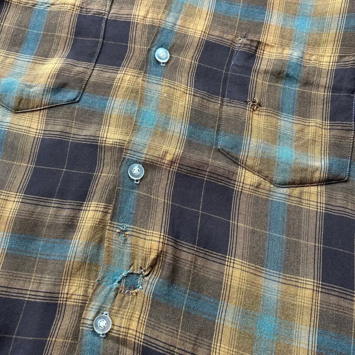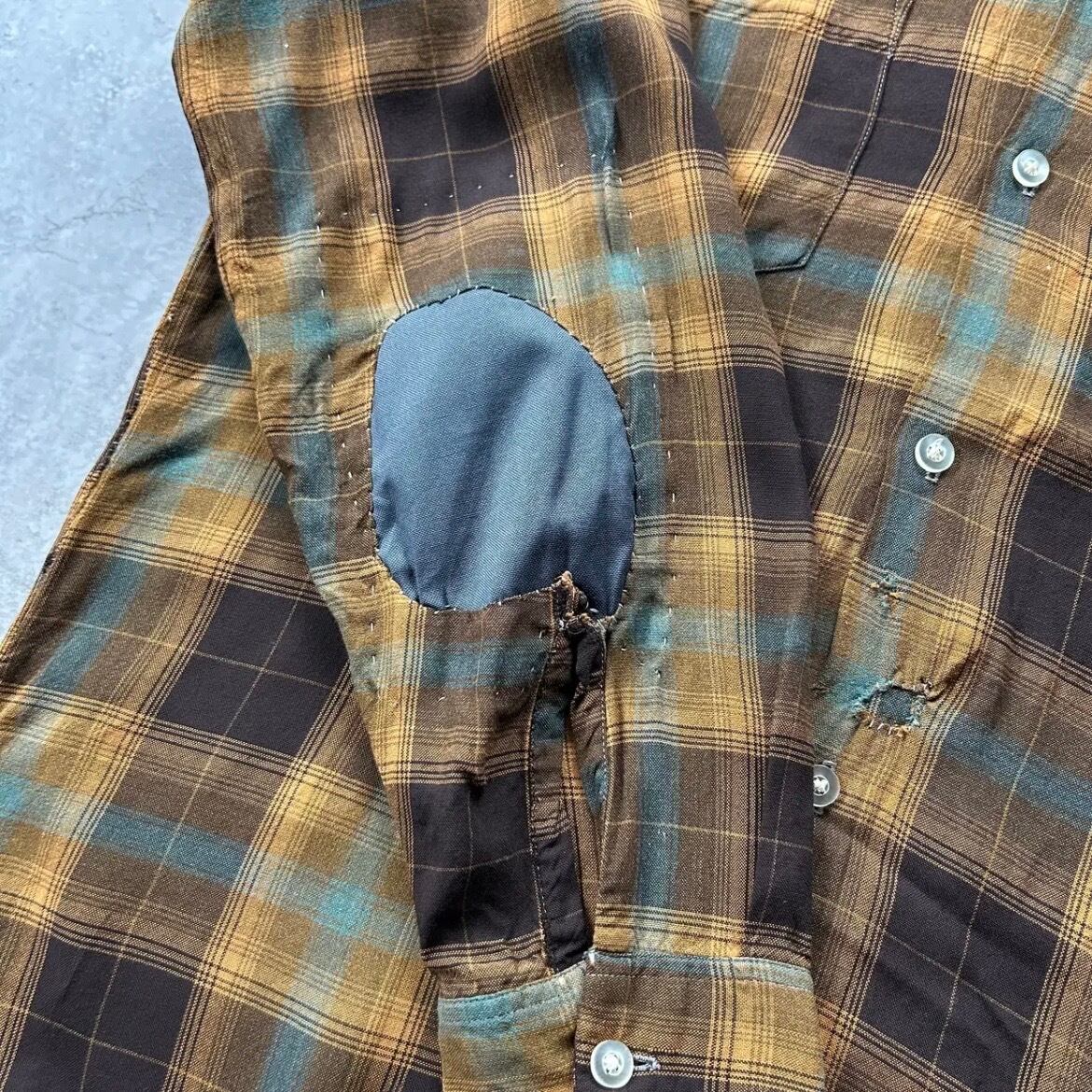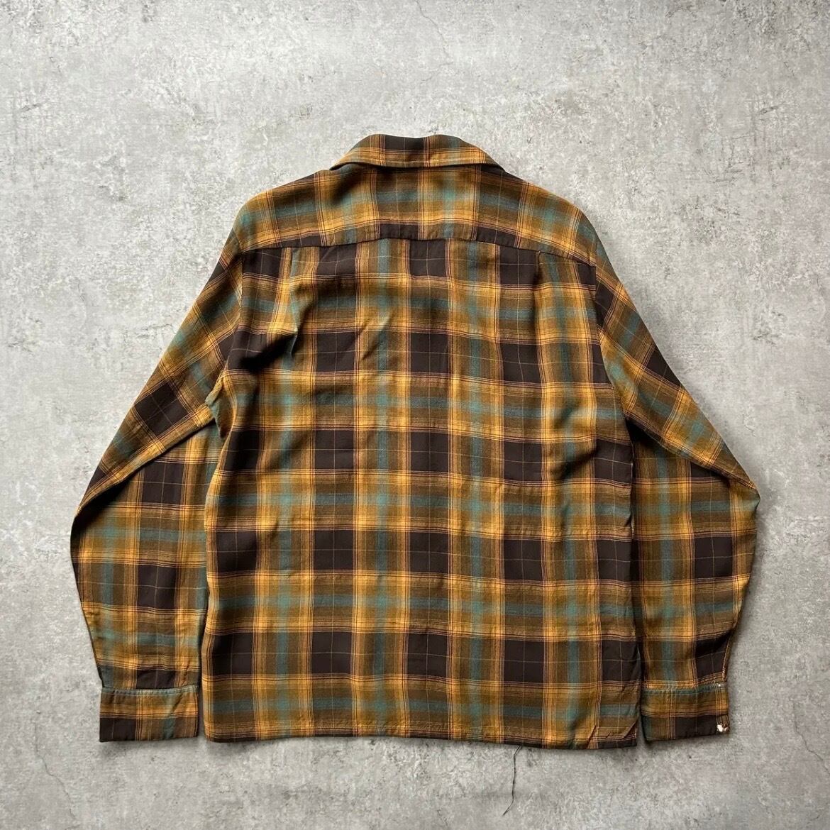 70s シアーズ オンブレチェックレーヨンシャツ ブラウン×イエロー M 襤褸
