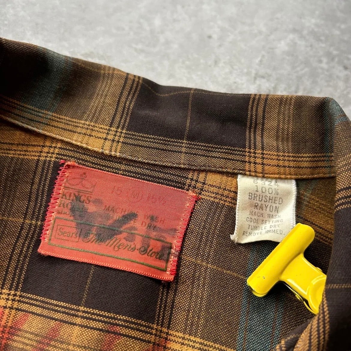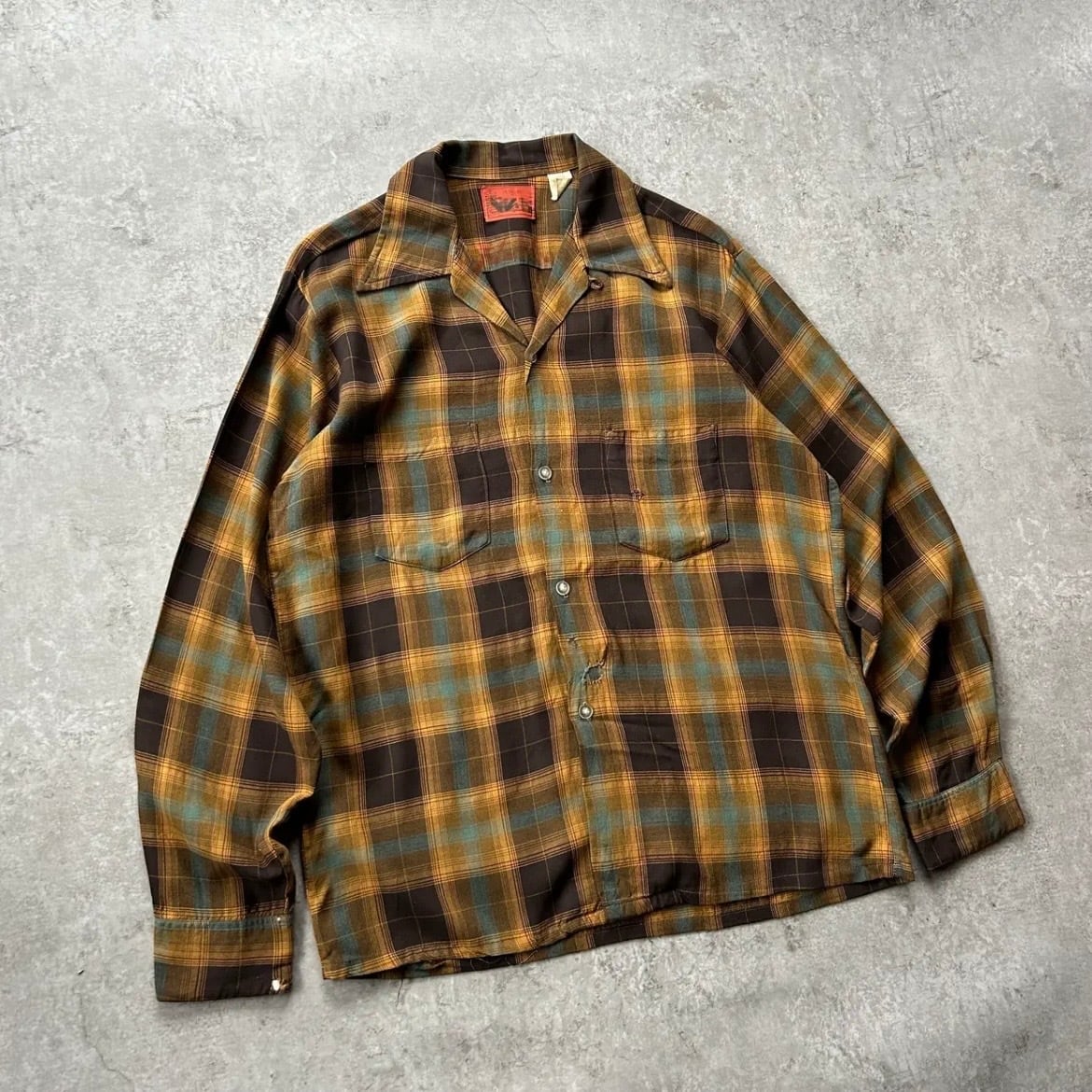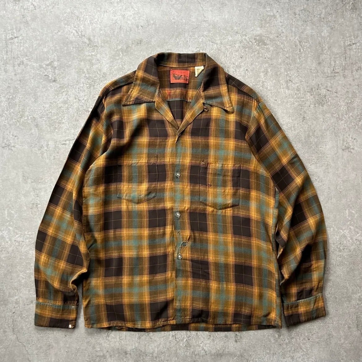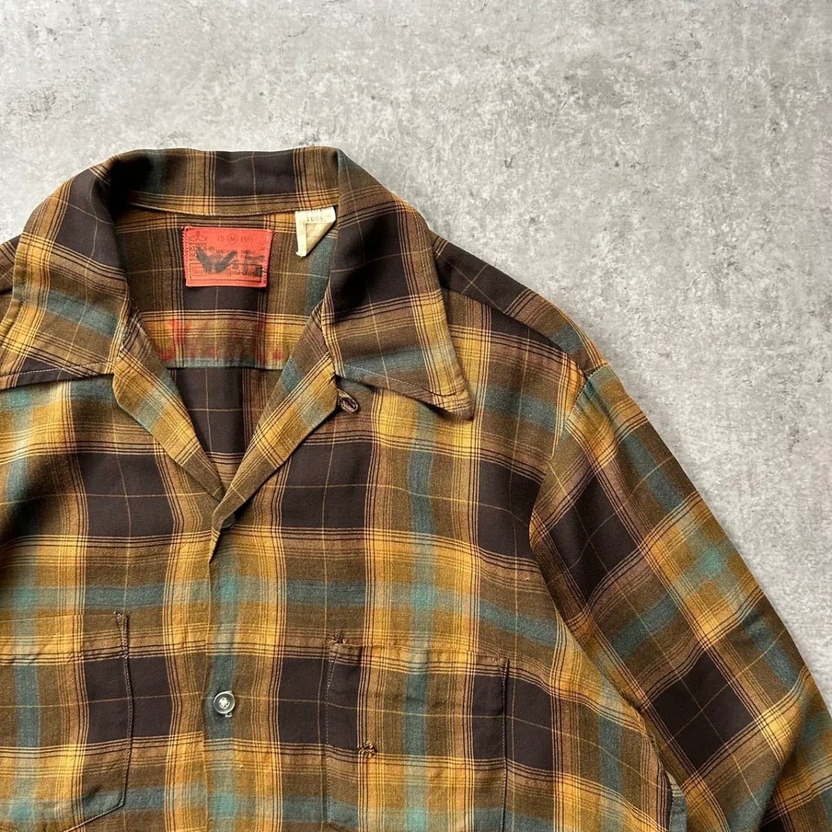 70s シアーズ オンブレチェックレーヨンシャツ ブラウン×イエロー M 襤褸