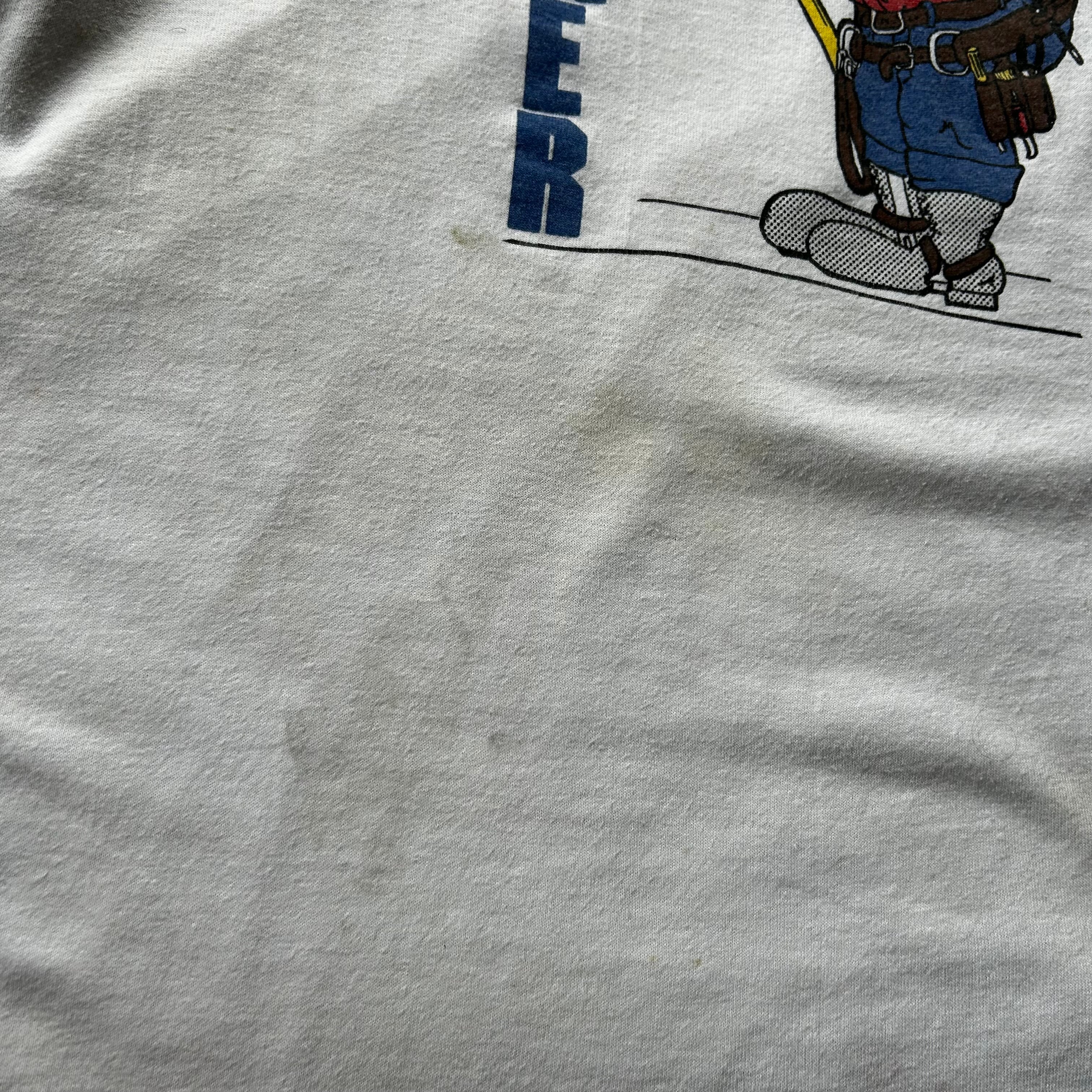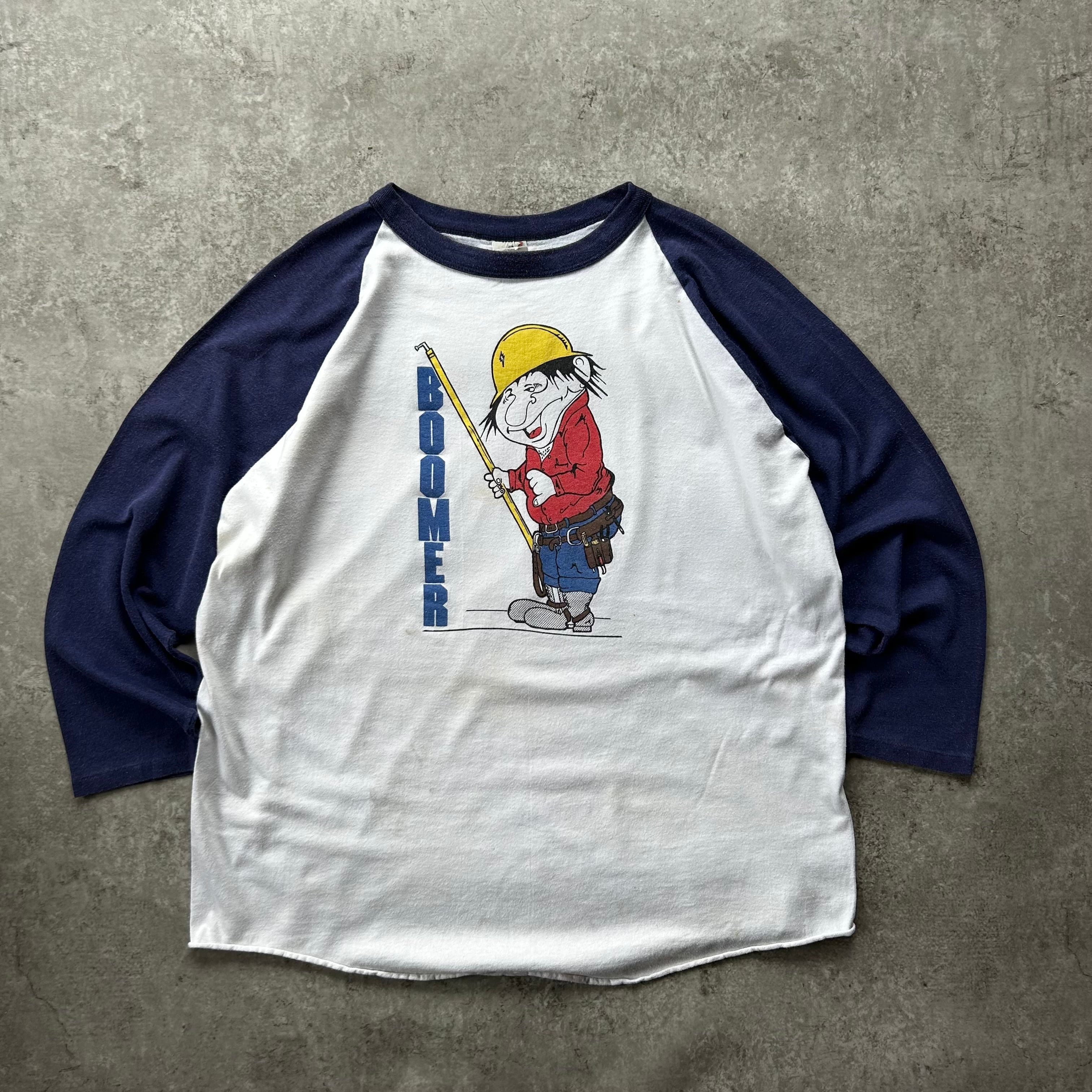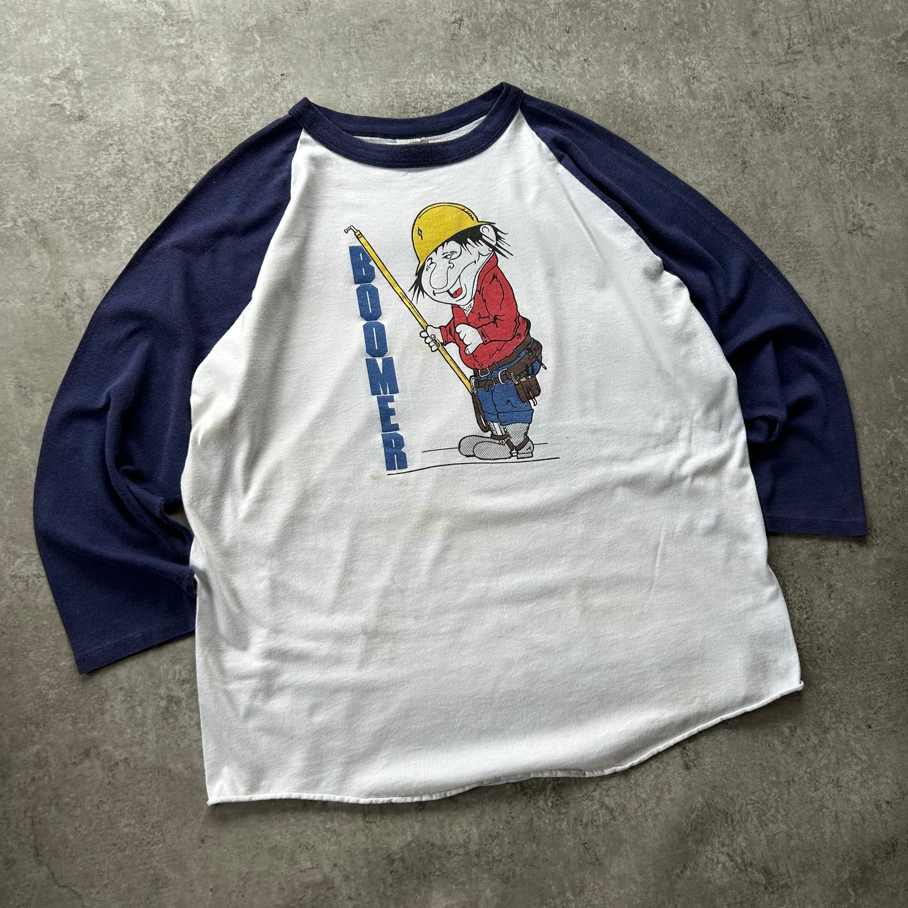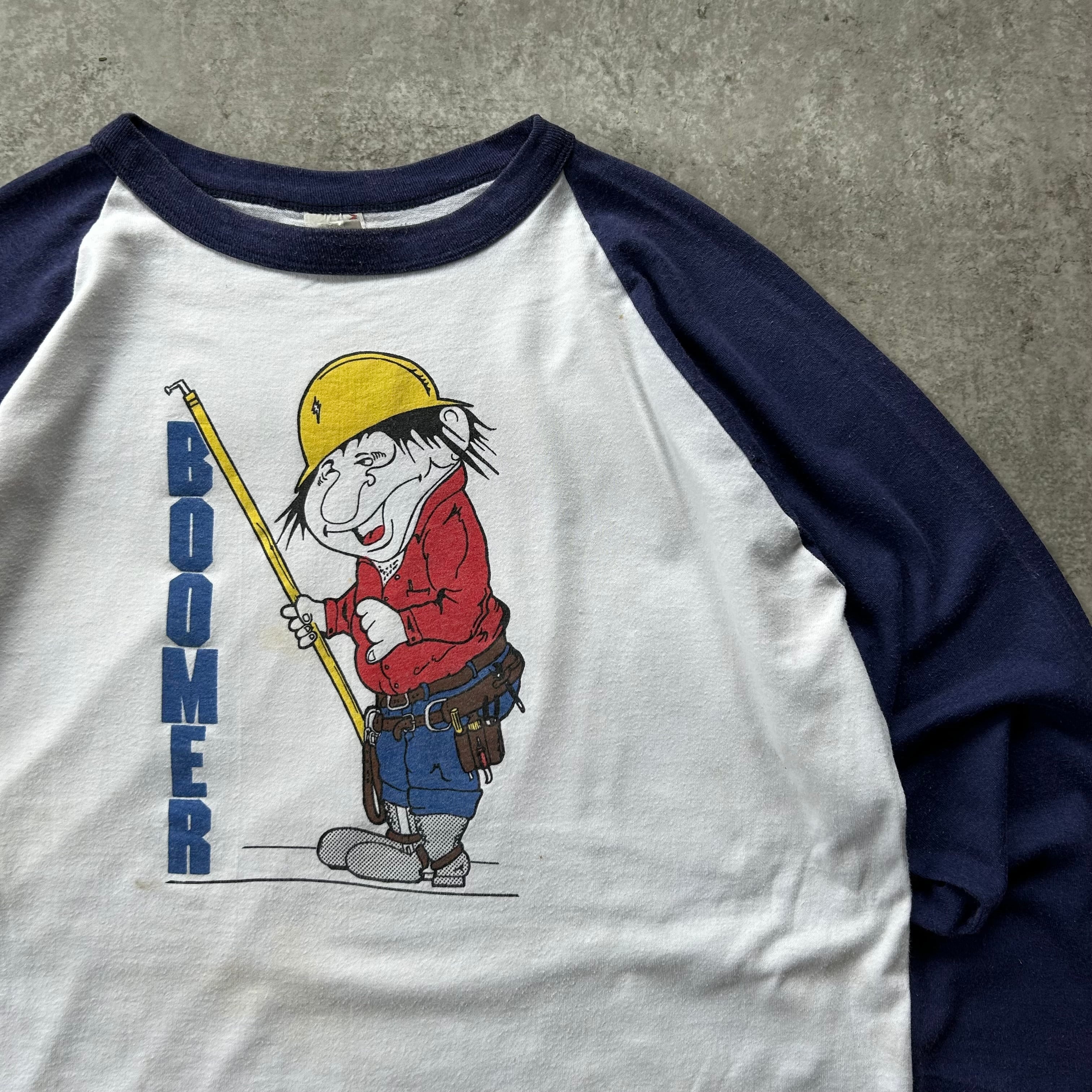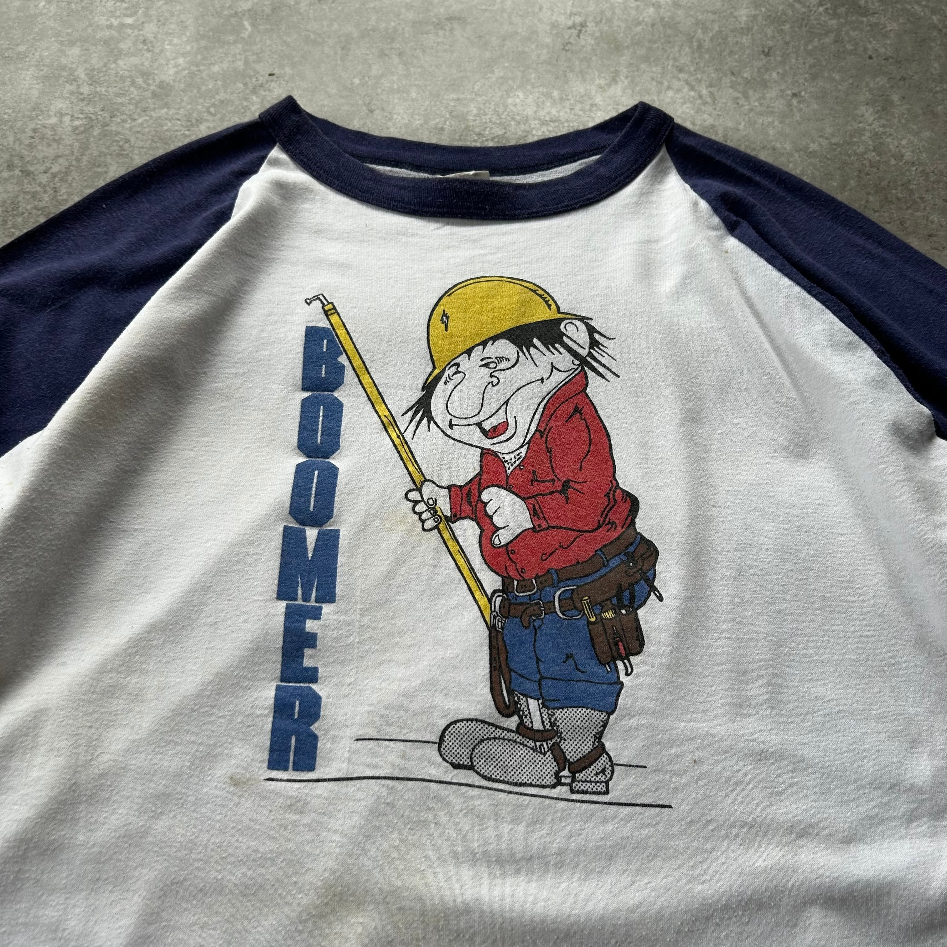 「boomer」のロゴとともに建築系の職人が描かれたアメリカ古着らしいデザインの一着。