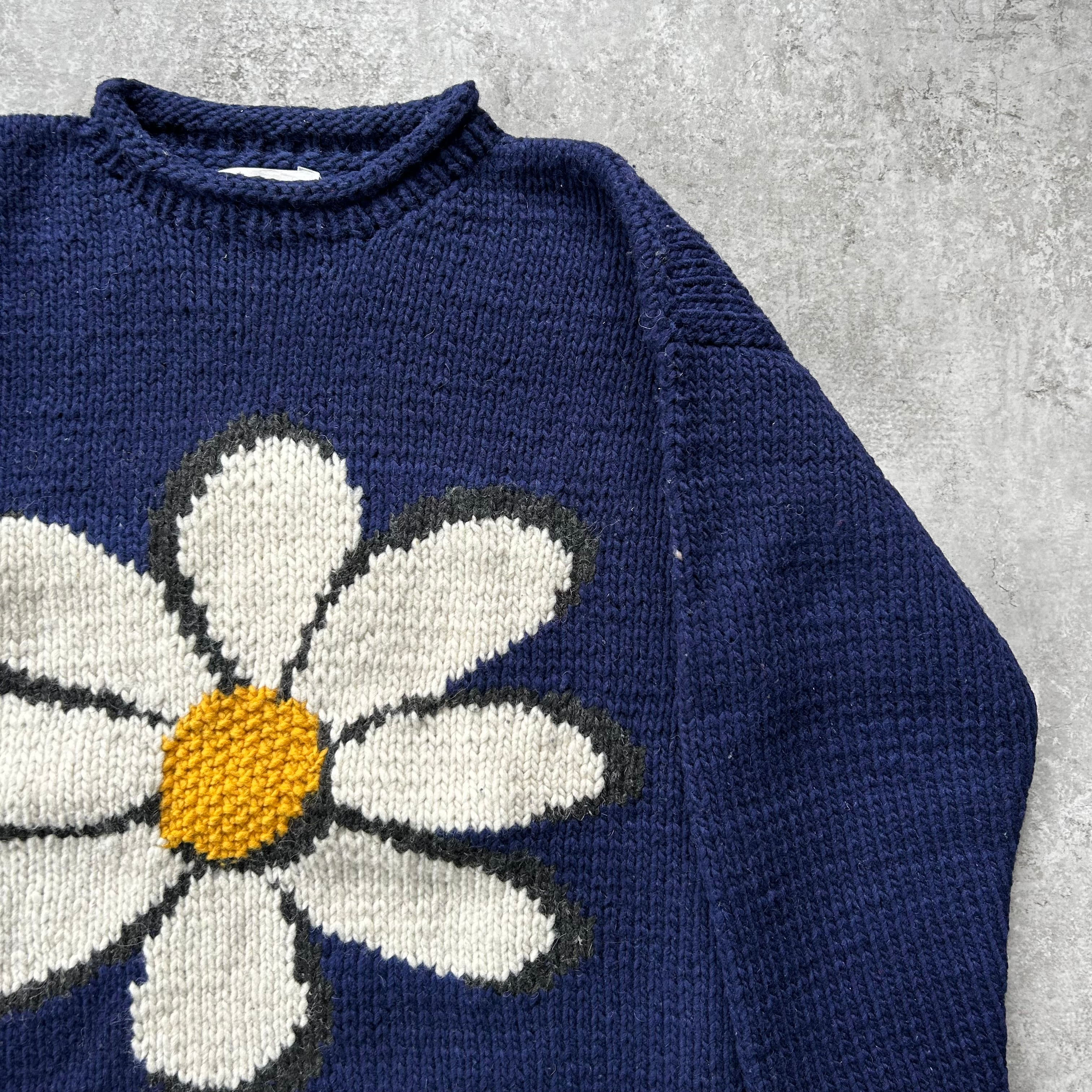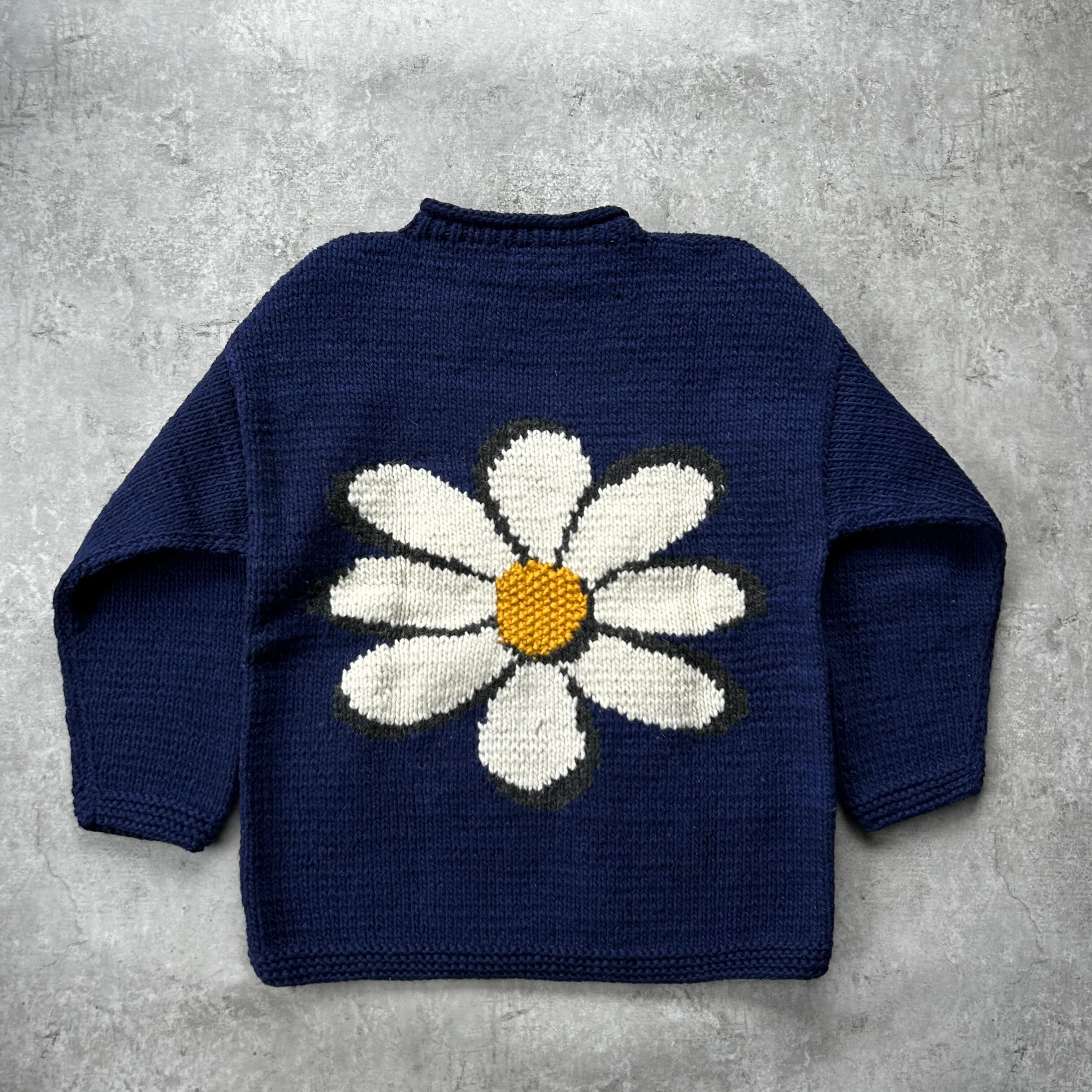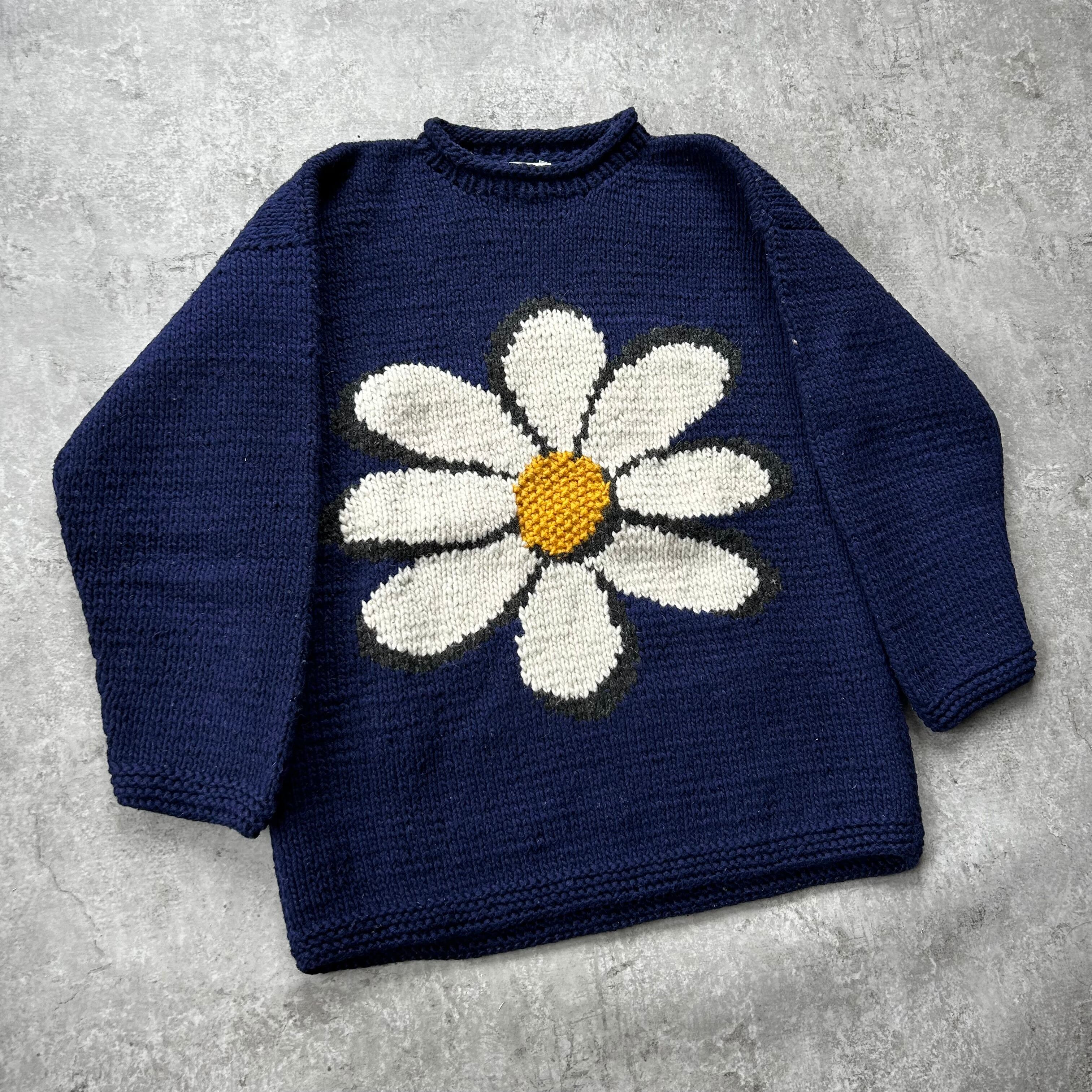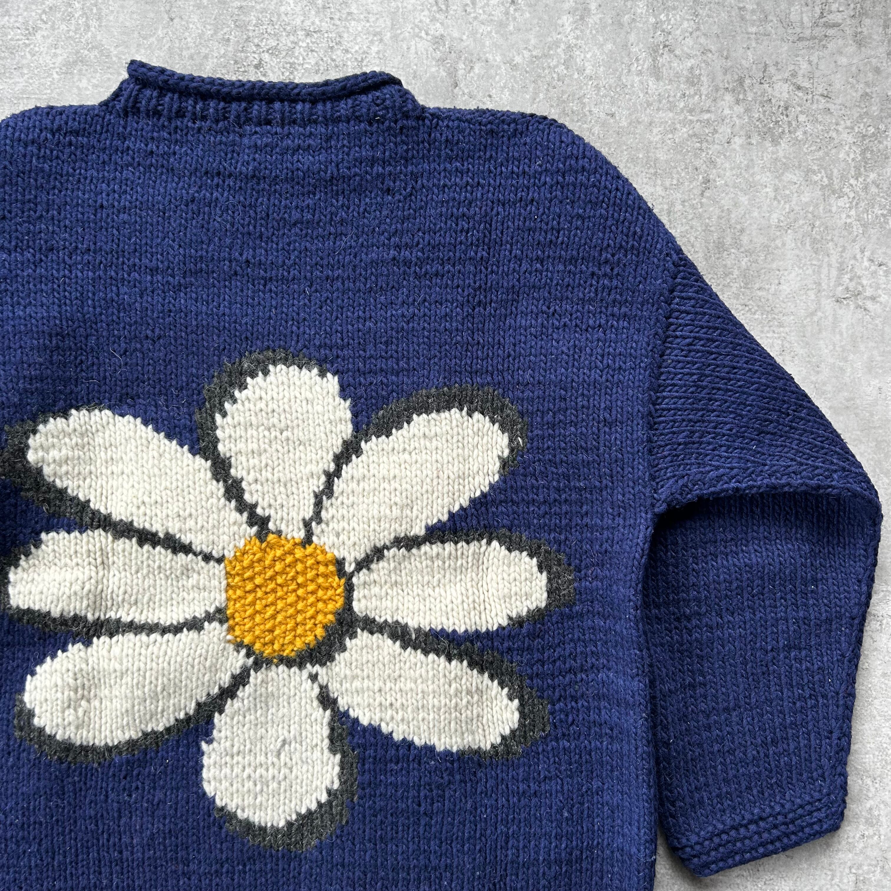 80s90s エクアドルニット ネイビー 花柄 マーガレット L相当