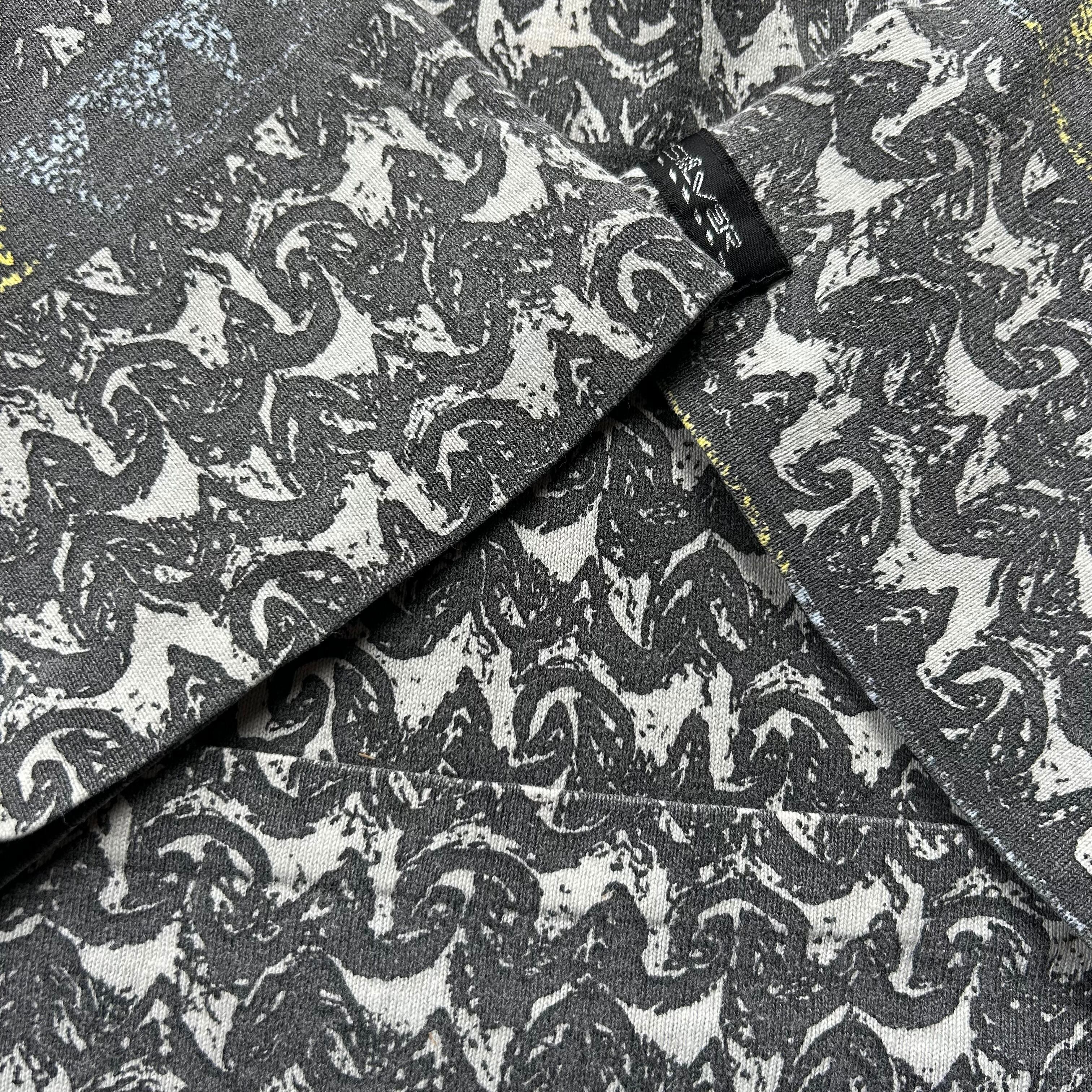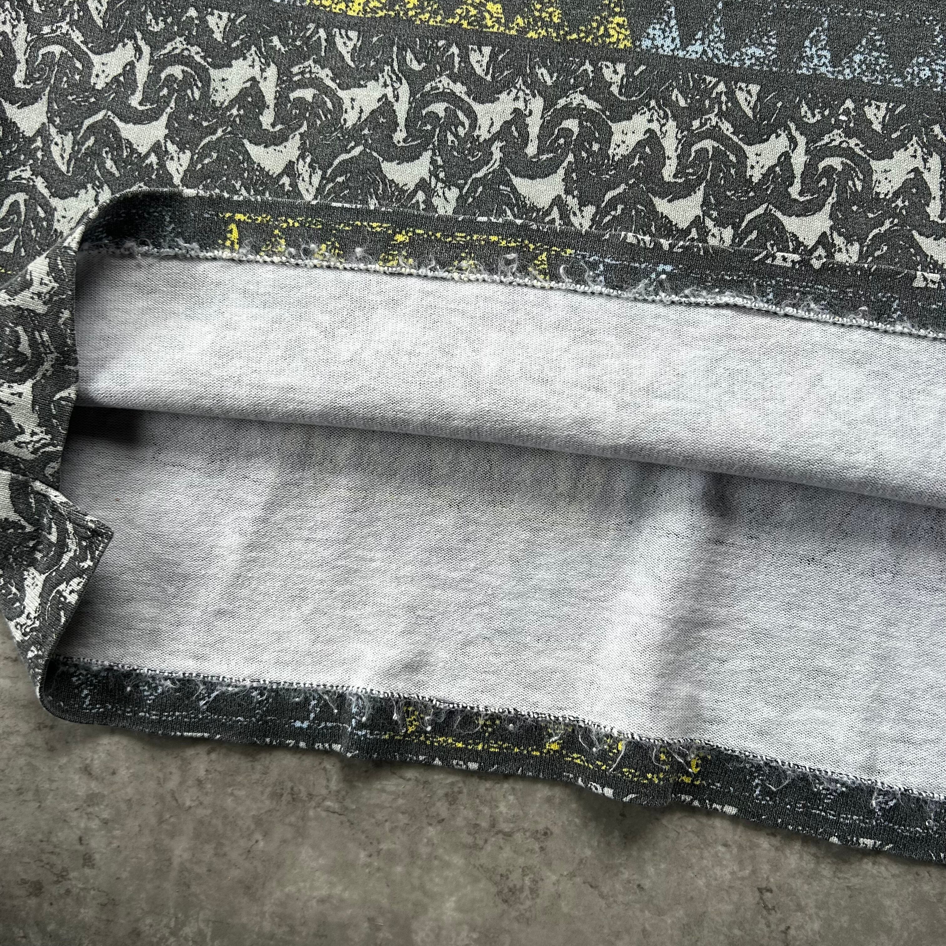 トライバル風な幾何学なデザインがインパクト大で、恐らく2000年代寄りのアイテムながらも袖・裾ともにシングルステッチ。